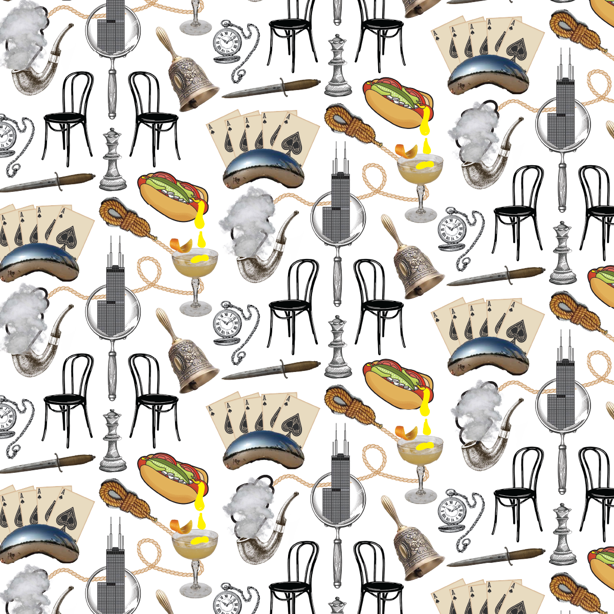 The show needed a new step and repeat background for their audience to take photos with. So I created a custom illustrated repeating patterned wallpaper, styled in the show's setting of early 1900s. I first created a pattern that included objects from their show like the magnifying glass, famous Chicago landmarks like the Art Institute lions, and elements from improv at Second City like the notorious Bentwood chairs. I then hand drew each illustration with an ink pen and scanned the drawings into illustrator and then edited the graphics for maximum readability. I created a custom color pattern and added in additional texture and depth.