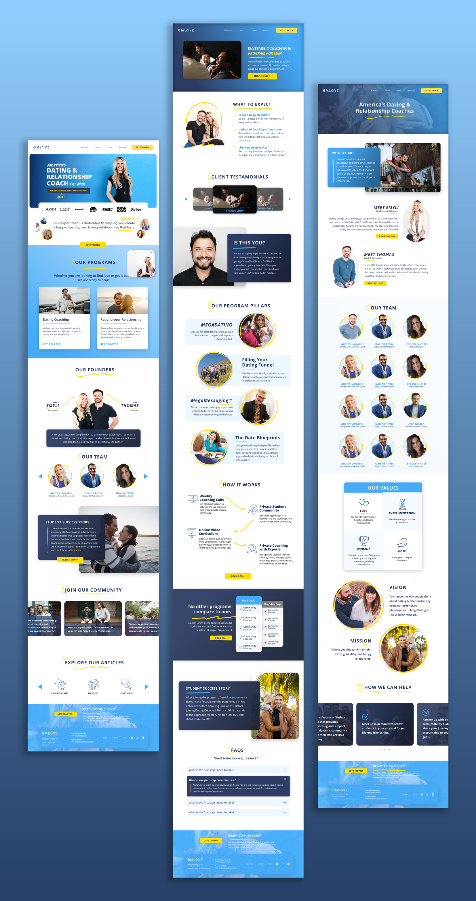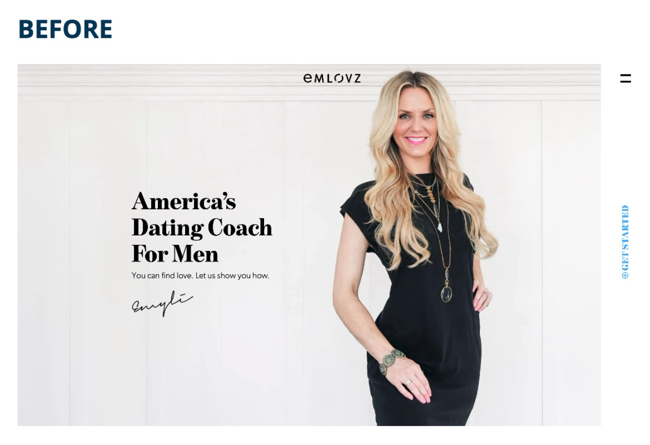 Through their services are top of their field, emlovz's website and branding did not tell the correct story to their clients. Their site was too sterile and impersonal for being a dating coaching service. The hierarchy was disjointed and there were many conflicting CTAs. There were over 100 pages on the site, leaving the user overwhelmed and confused.
